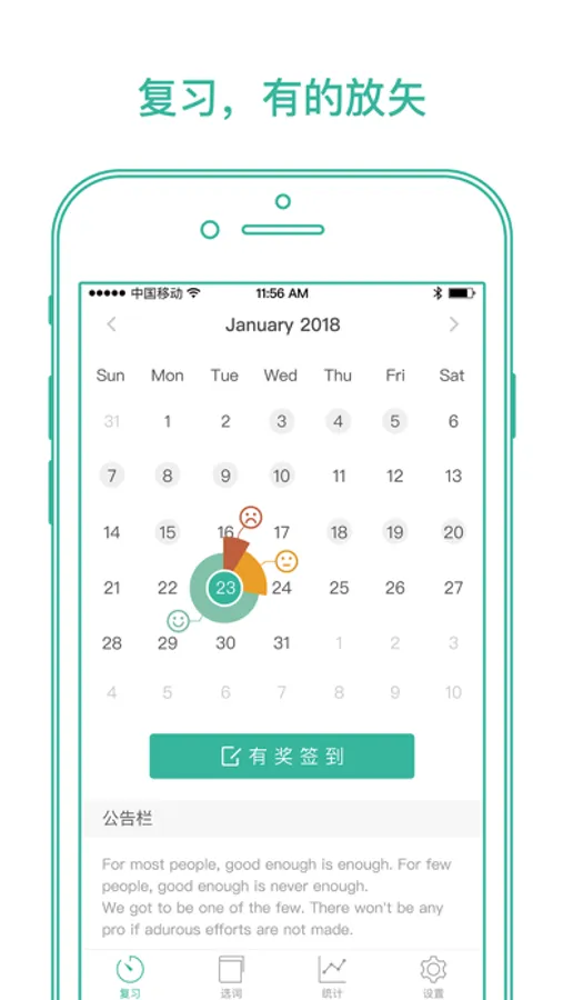 墨墨背单词以图表的方式记录了你复习的情况,并配合丰富的奖励策略有效地督促你更好地坚持复习,包括三大图表统计系统: