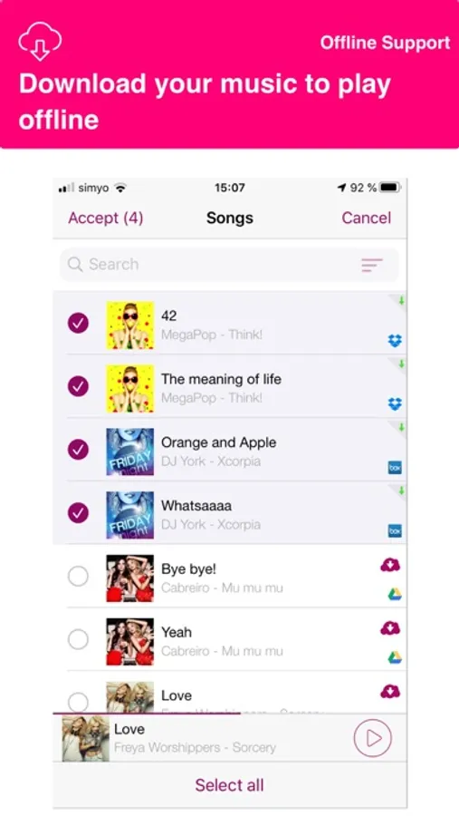 Cloud Music allow you to play Offline (Download) or in Streaming all your music stored on your favorite cloud:
