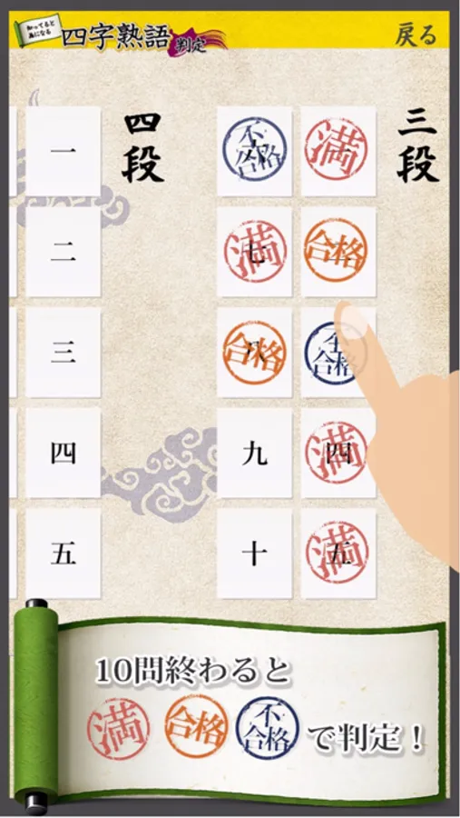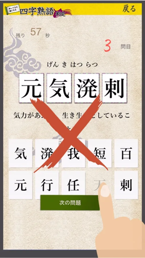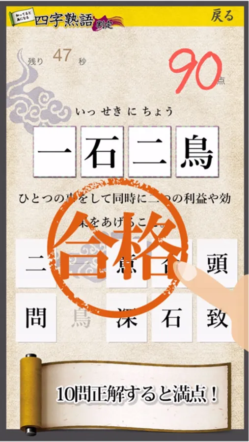 ゲーム感覚で自分の知識を試し、分からなかった四字熟語は何度もやり直すことで、四字熟語の知識を増やしましょう。