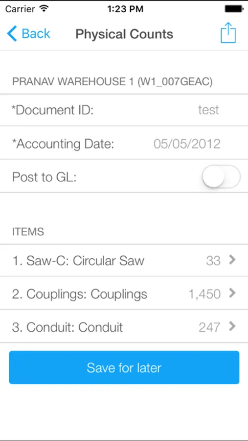 e. Count: Based on Inventory module license, user can count and record inventory items at a warehouse.
