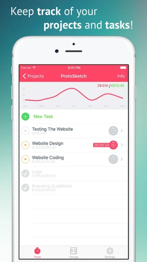Stay organised and track all your current projects, a beautiful graph will show you how much work you tracked each day on each project the last week so you balance multiple projects at the same time.