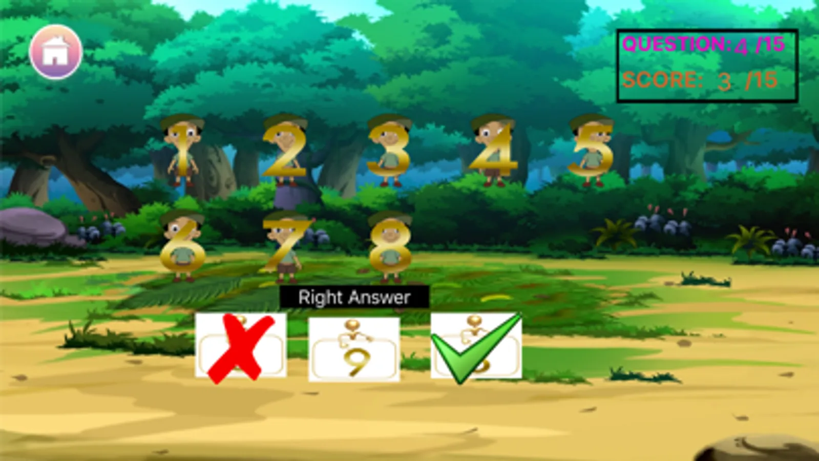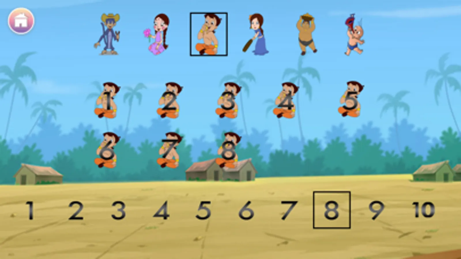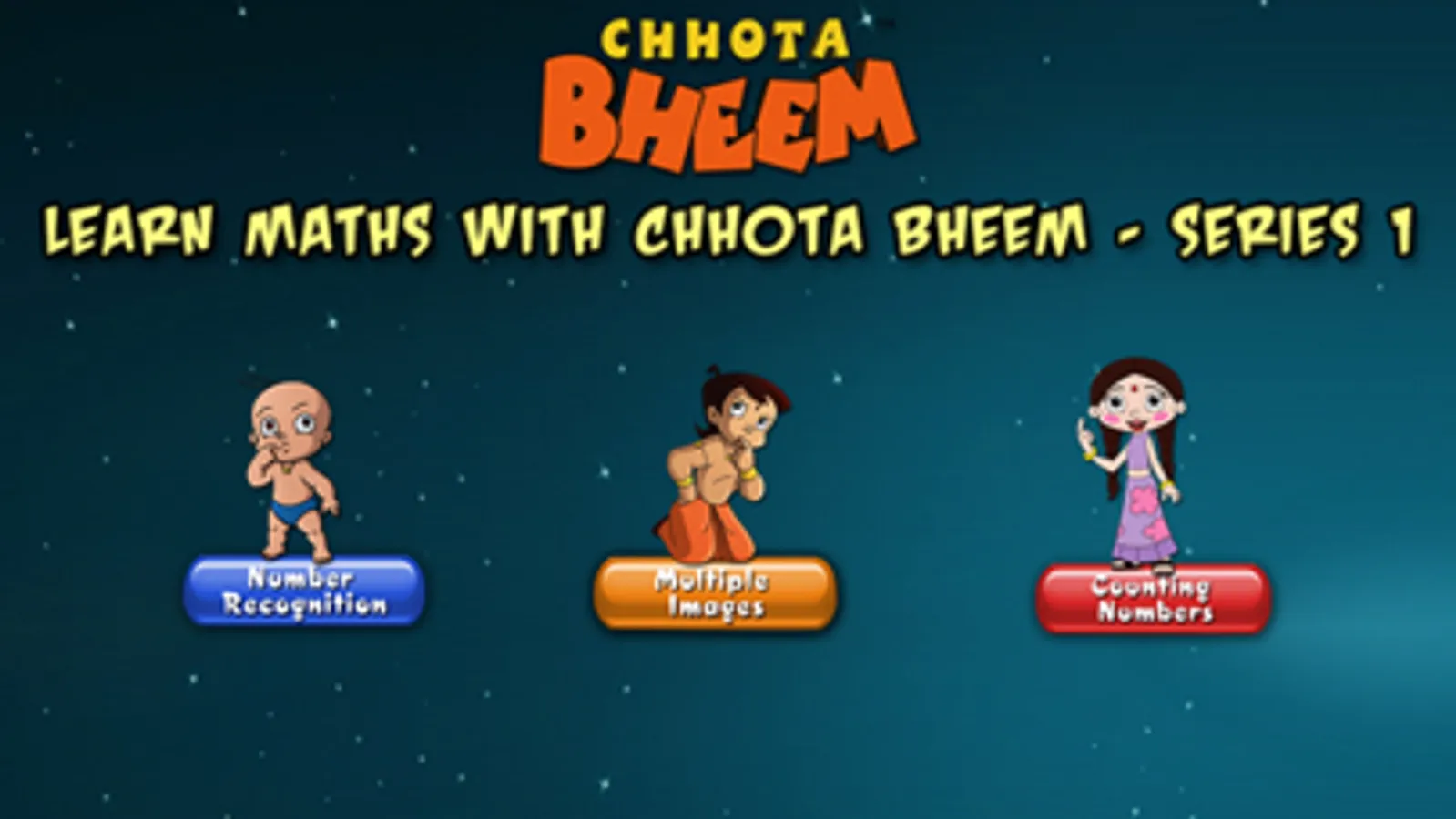 Counting numbers: In this, different Chhota Bheem characters will appear and the kids need to count the number of times they appear and then select the correct answer. Correct answers are greeted with encouraging applause, incorrect attempts are provided a correction identifying the number.