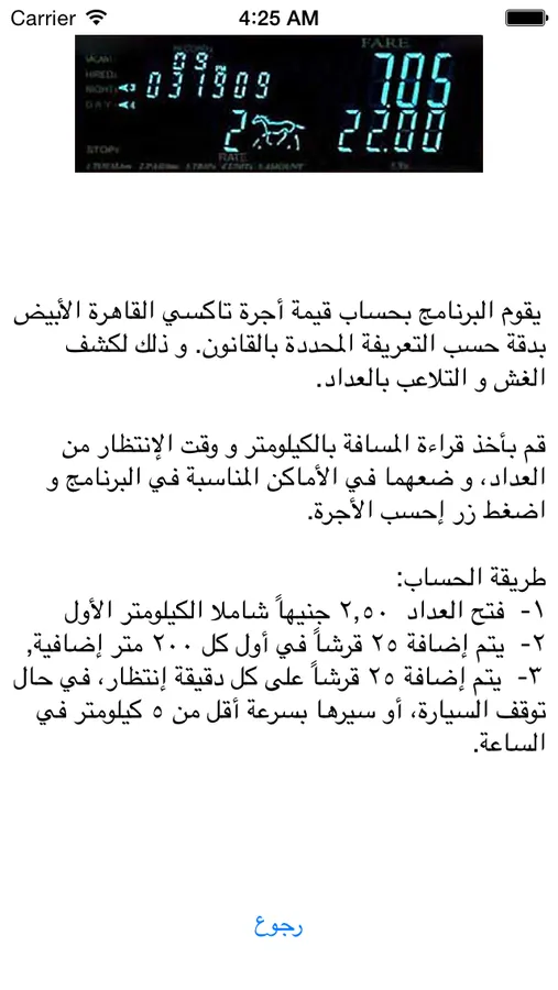 ملحوظة: هذا البرنامج مخصص لتاكسي القاهرة الأبيض فقط. ولا يقوم بالحساب لأي مدينة أو دولة أخرى.