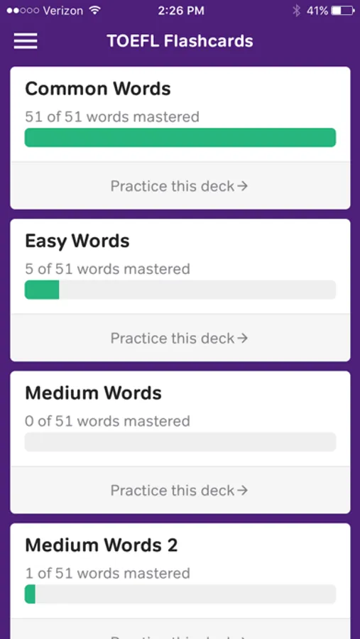This app gives you free access to all of Magoosh’s TOEFL flash cards. Sign in with a Magoosh account (or create a new one) to save your progress to the web. You can continue your practice online at http://toefl.magoosh.com/flashcards/vocabulary