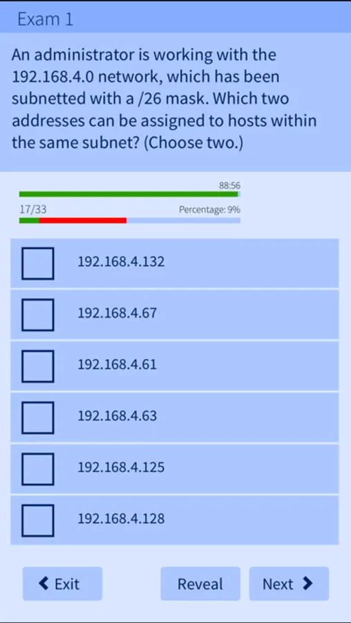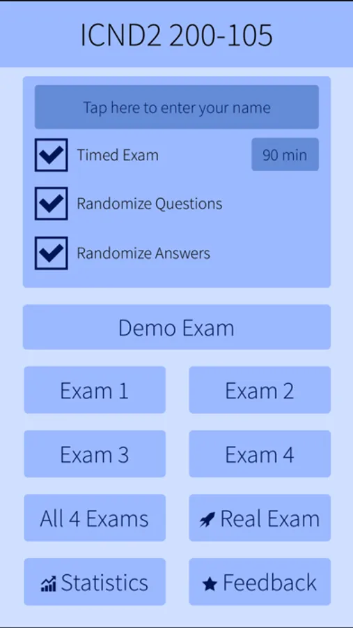 The app contains a "Full exam" consisting of all 4 exams containing 90+ questions. A Real Exam simulation is also included containing 50-55 questions featuring all the realtime features to simulate the closest similarity to the real ICND2 200-105 exam.