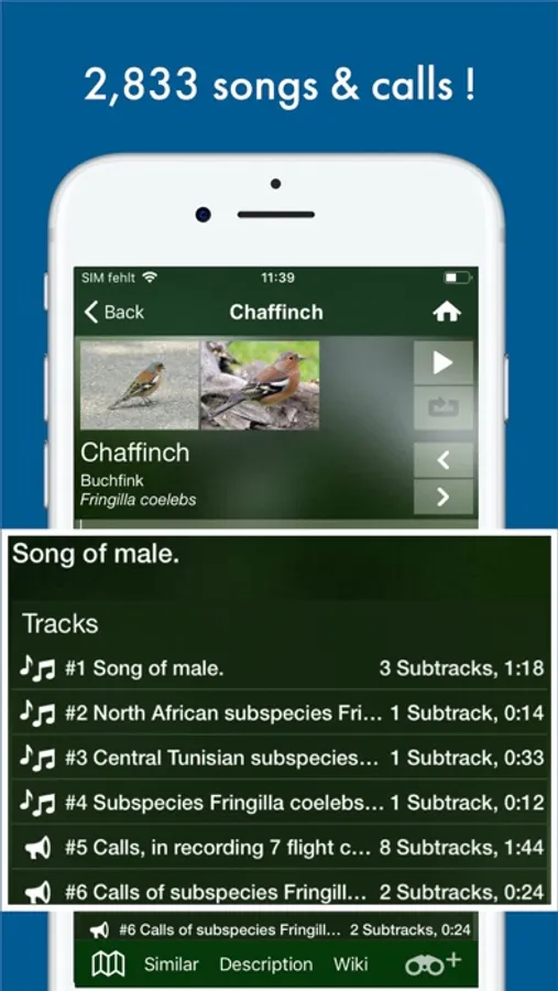 All species can be browsed according to their taxonomical classification and can thus be easily compared. Spectrograms to all sounds as well as high quality photographs and descriptions to each species are also included. As a novelty and practical advantage, multiple songs and calls of one species are arranged consecutively on separate tracks. Some tracks consist of several calls, which can independently be chosen and played immediately without the need to fast-forward. This adds up to 2,837 bird sounds altogether! Explanations to all recordings are given, bird names are given in English, Latin and German, French, Italian, Spanish and other languages, see below.