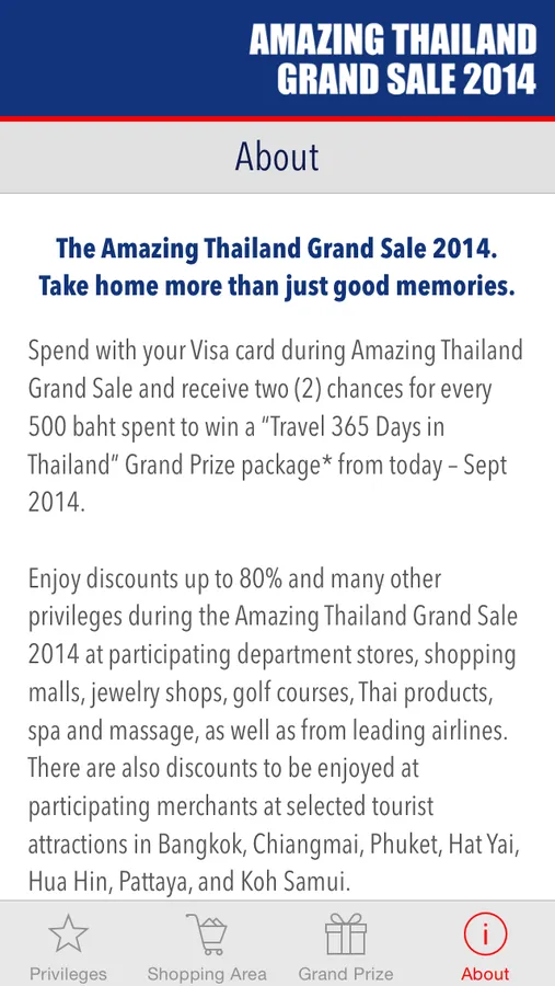 Thailand Shopping Paradise application provides shopping privilege information form more than 15,000 establishments in seven of Thailand’s most important tourism cities (Bangkok, Chiang Mai, Phuket, Hat Yai, Pattaya, Hua Hin and Samui) are participating in the “Amazing Thailand Grand Sale 2014”, which will be held between 15 June – 30 September, 2014, making it the biggest ever.