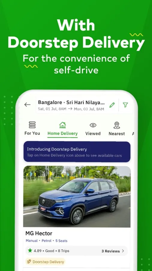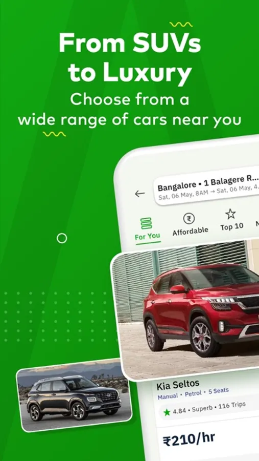 Experience true freedom when you hire a self drive car from our car renting app. From a luxury car to impress that dinner date to an SUV for the perfect week-long vacation, a compact for those weekday errands or a sedan with ample space, the fastest car for your next solo road trip or that powerful EV that you'd have to drive before you buy - hire a self drive car that suits all your needs with ease.