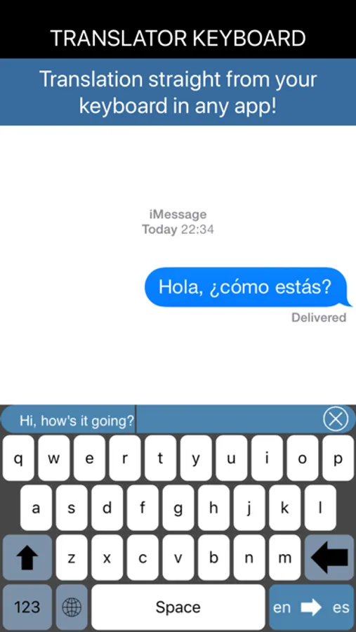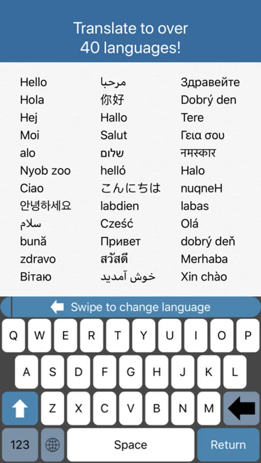 Translator Keyboard allows you to write in another language straight from your keyboard! It’s quick and easy to switch between translator keyboard and your normal keyboard. You can use translator keyboard in any app - write text messages, send e-mails, or translate your text to another language anywhere anywhere you like. Choose from over 40 languages to translate to!
