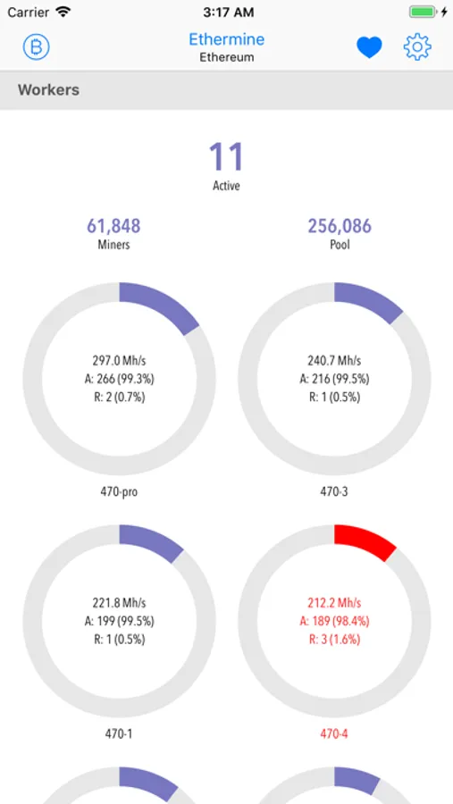 • Show workers in bright red when rejected shares goes above a user-specified threshold specified in Settings