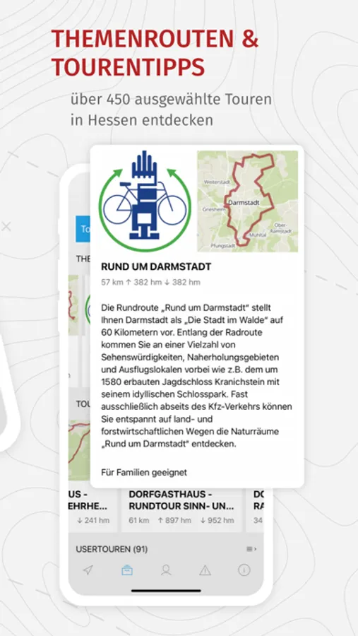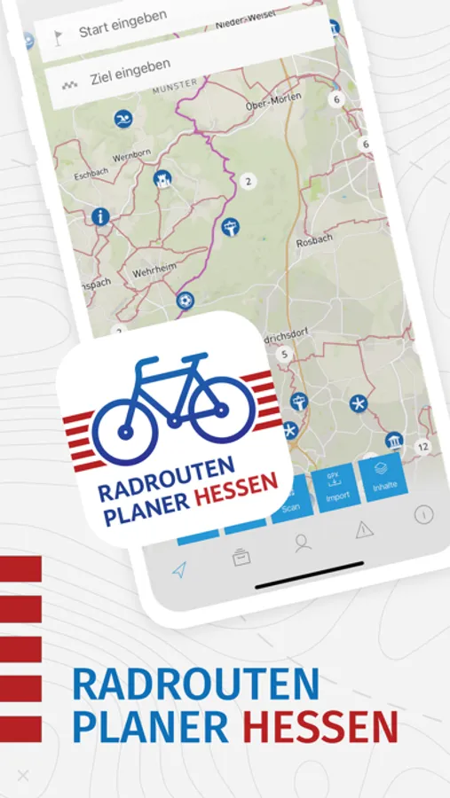Lassen Sie sich von über 450 ausgewählten Touren in Hessen inspirieren oder planen Sie Ihre individuelle Radtour. Mit Hilfe der Adresssuche oder dem Setzen von Routenpunkten auf der Karte, lassen sich ganz einfach Radtouren in ganz Hessen planen. Anhand der Streckendetails zur Länge und Dauer und dem Höhenprofil kann die Tour noch besser geplant werden. Informieren Sie sich über Sehenswürdigkeiten am Wegesrand, Standorte von Leihfahrrädern, Lademöglichkeiten für E-Bikes und vieles mehr. Und auch die Services Meldeplattform Radverkehr und der Schülerradroutenplaner sind über die mobile Anwendung nutzbar.