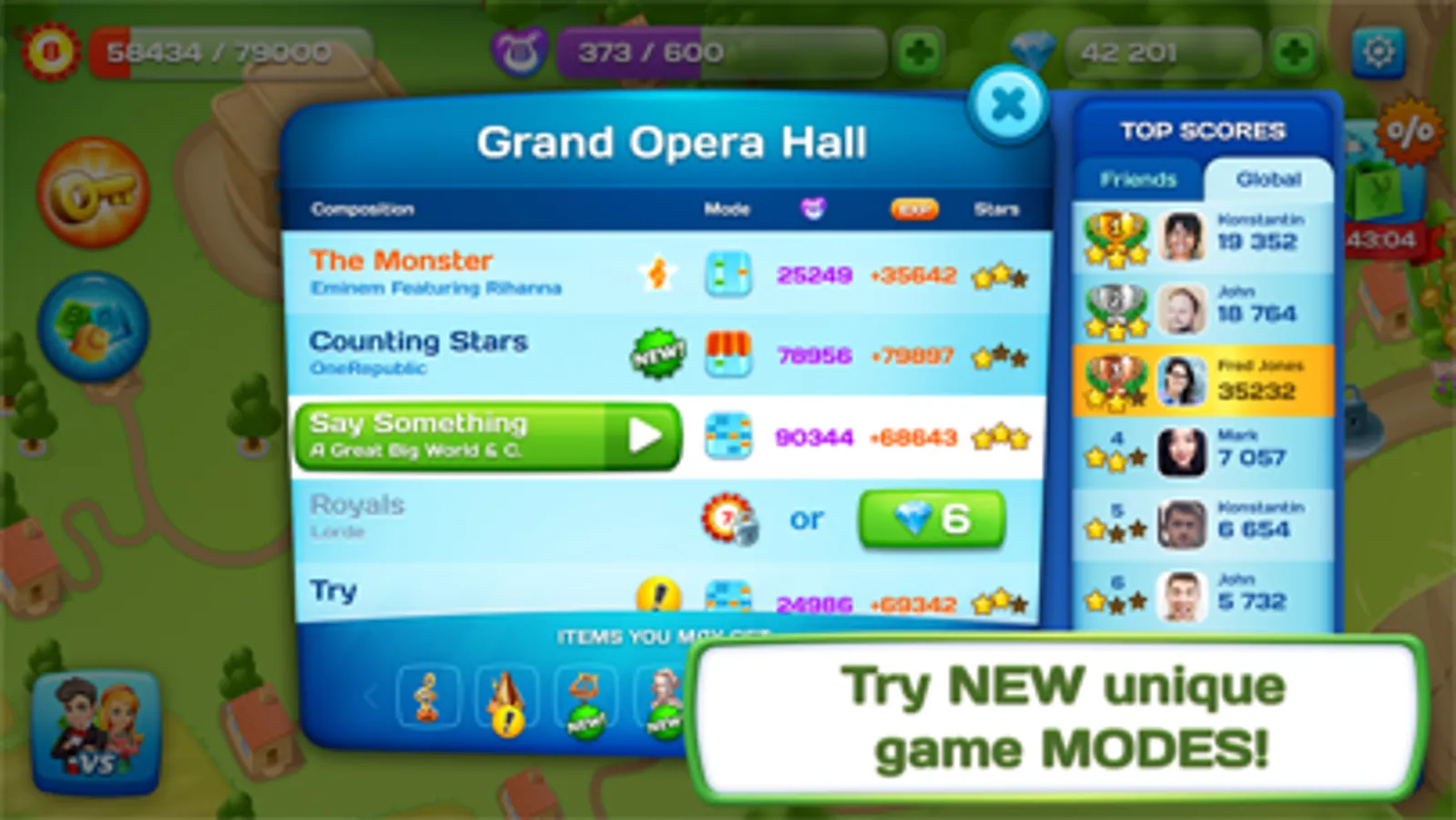 Play classic music and modern hits alike, featuring SIA, OneRepublic, Maroon 5, Imagine Dragons, Cranberries and others. Progress through the map, complete diverse musical quests and show the world who is the real star!