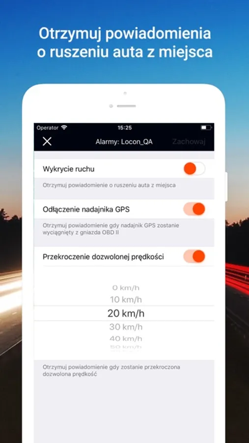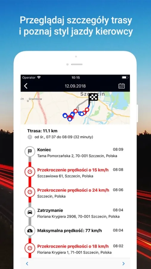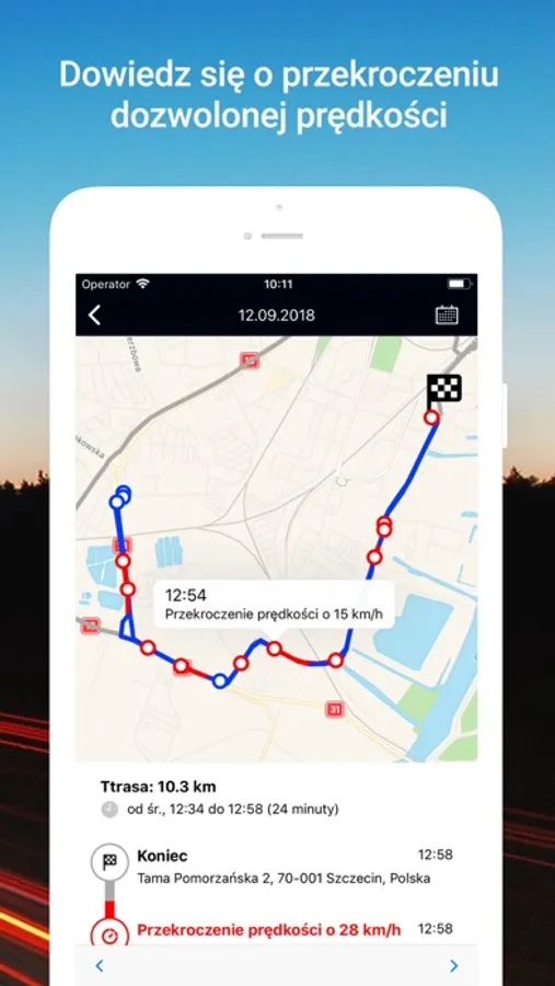Otrzymasz powiadomienie natychmiast kiedy kierowca przekroczy dopuszczalną prędkość na trasie. Sam zdefiniujesz wartość przekroczenia prędkości, po której otrzymasz powiadomienie.