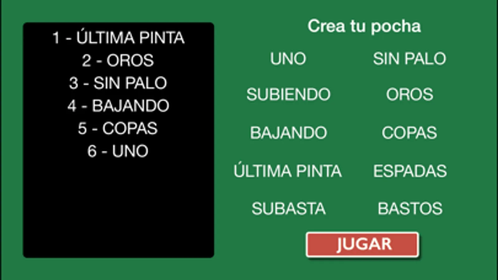 - Jugar a 10 tipos diferentes de rondas: UNO, SUBIENDO, BAJANDO, ÚLTIMA PINTA, SUBASTA, SIN PALO, OROS, COPAS, ESPADAS y BASTOS