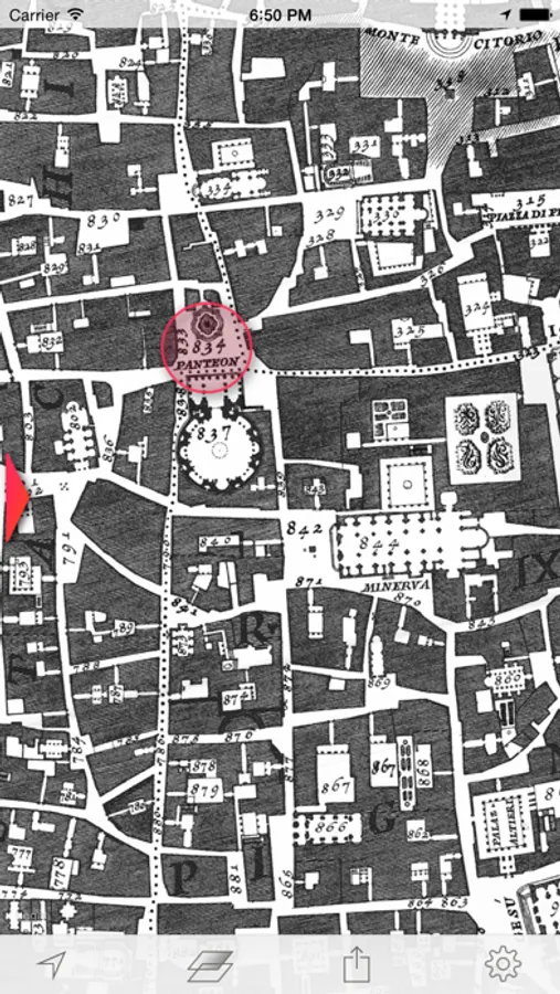 Therefore the app reproduces in the indices on the left side of the map exactly those types in the exact order and (to the contemporary reader occasionally appearing outmoded) notation as provided by Giambattista Nolli in his indices. By selecting an entry you will be led to the corresponding location on the map. You can also browse by tapping on one of the numbers on the map to see what it is about.