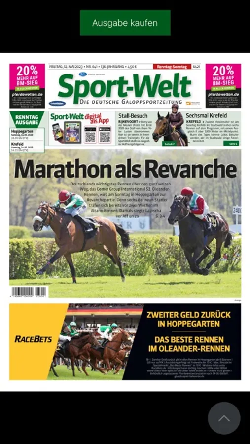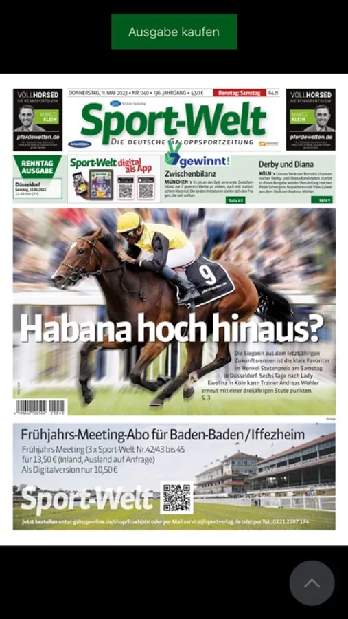 Die Sport-Welt in digitaler Form, jetzt für das iphone und das ipad. Die seit über 125 Jahren erscheinende Sport-Welt ist die älteste Sportzeitung Deutschlands und berichtet 150 Mal im Jahr über das nationale und internationale Turf-Geschehen. Die Sport-Welt ist damit der unverzichtbare Begleiter für alle Freunde des Galopprennsports und den Pferdewetter. Berichte rund um alle deutschen Renntage und die internationalen Highlights, Interviews, Zuchtthemen, Kommentare und Kolumnen, Statistiken und vielfältige Wettinformationen und Wett-Tipps zeichnen die Sport-Welt aus. Für alle deutschen Renntage gibt es ein herausnehmbares Rennprogramm mit Starterfeldern, Rennfarben, Formen und Tipps.