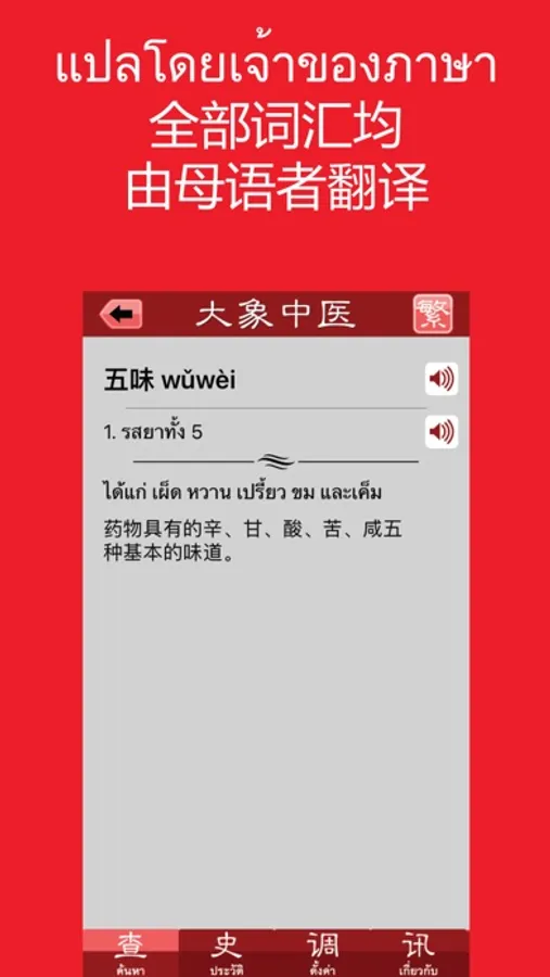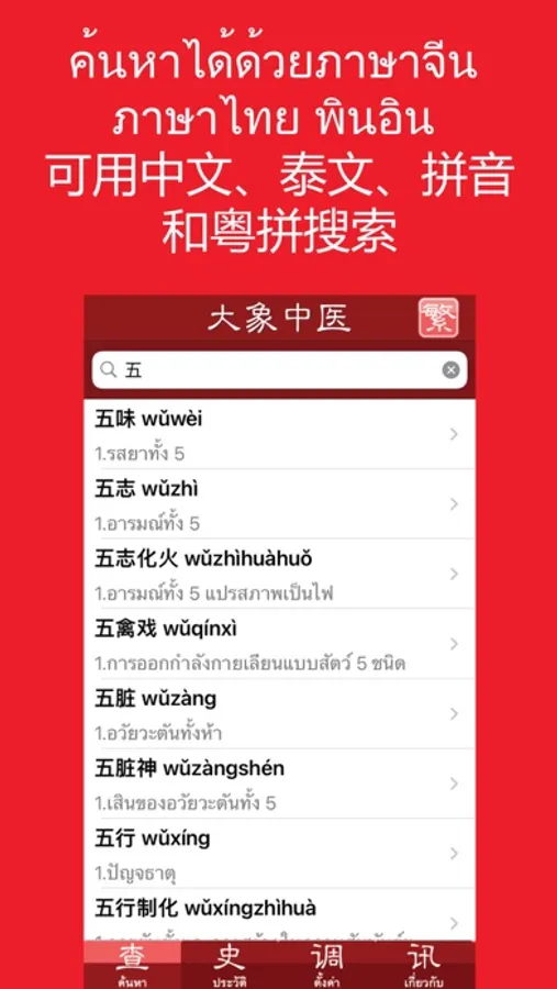 大象中医软件收集各种中医常用的词汇,包括中医基础理论、中医疾病诊断、中医药剂、针灸、中药熏蒸和中国按摩等词汇,可显示简体中文(Chinese(Simplified))、繁体中文(Chinese(Traditional))、拼音(Pinyin)、粤拼(Jyutping),设有已搜索词汇的界面,拥有词汇的泰文、中文(Mandarin)和广东话(Cantonese)的母语发音。