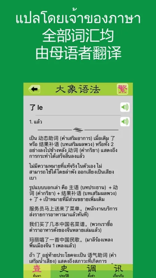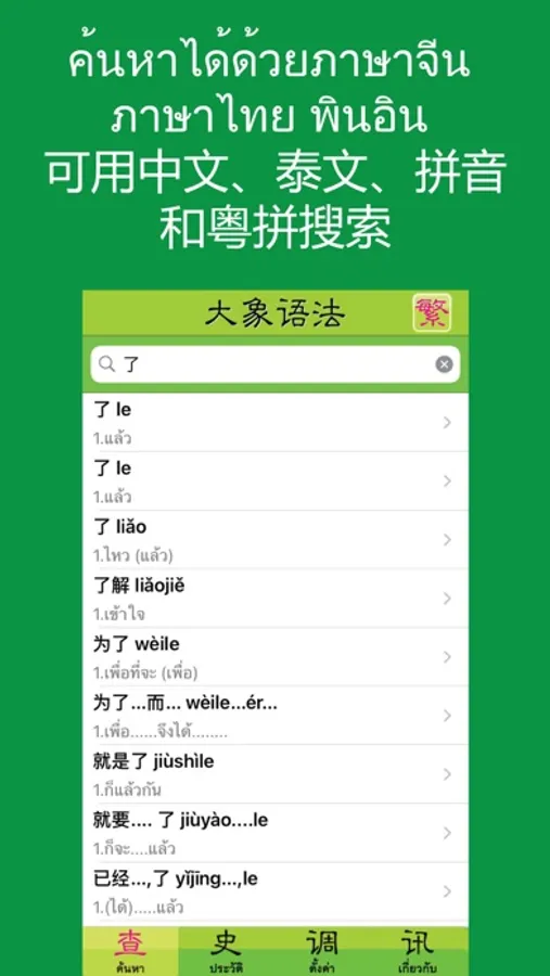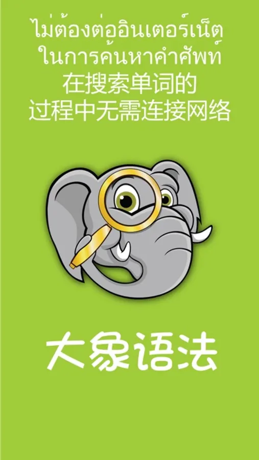 大象语法全面汇集了汉语语法的各种规则,突出汉语语法重要特点,包括词的种类(名词、动词、形容词、代词、副词、介词、连词、助词、数词、量词、叹词、拟声词)、各种短语、句子成分(主语、谓语、宾语、定语、状语、补语)、单句和复句等,显示简体中文、繁体中文、拼音(Pinyin)和粤拼(Jyutping),记录已搜索的词汇,拥有词汇的泰文、中文和广东话母语发音。