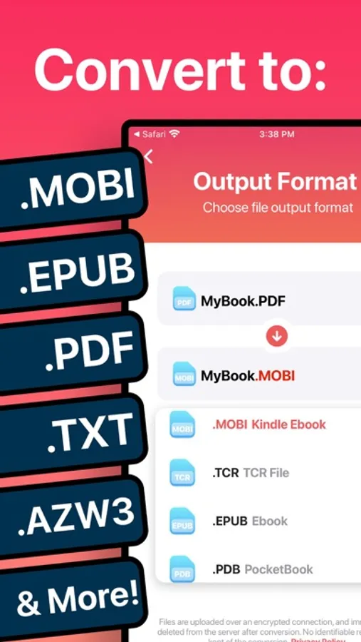 Save, Share or Open your converted ebooks in your favorite reader apps immediately. You can even browse your previously converted files with our in-app file browser.