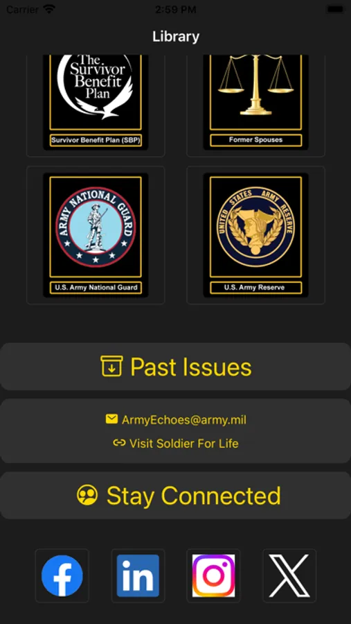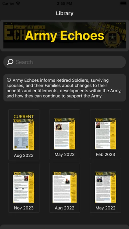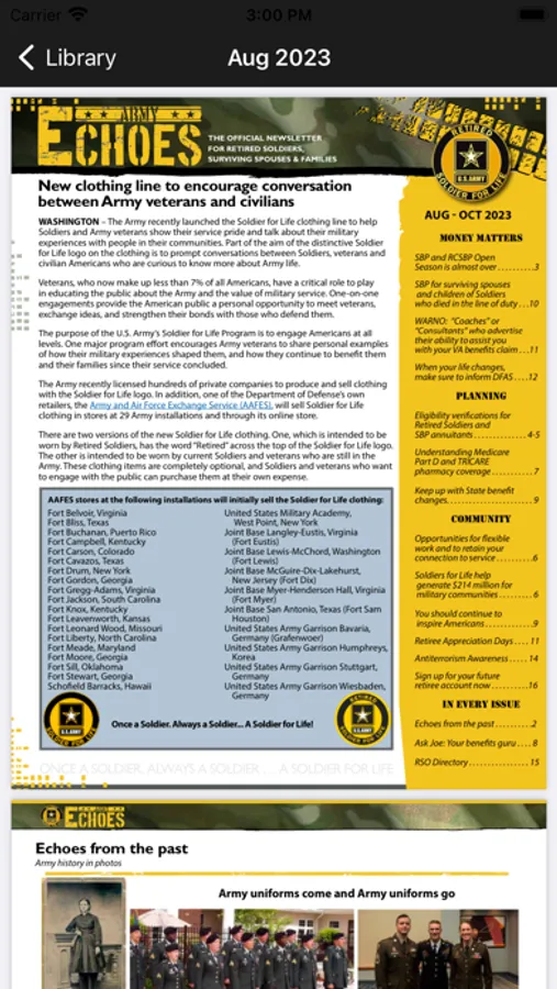 This app takes the Retirement Services Office's publications, Army Echoes, and provides easy access to the publication and its contents. Thus allowing more retirees access, knowledge, and information the publication provides.