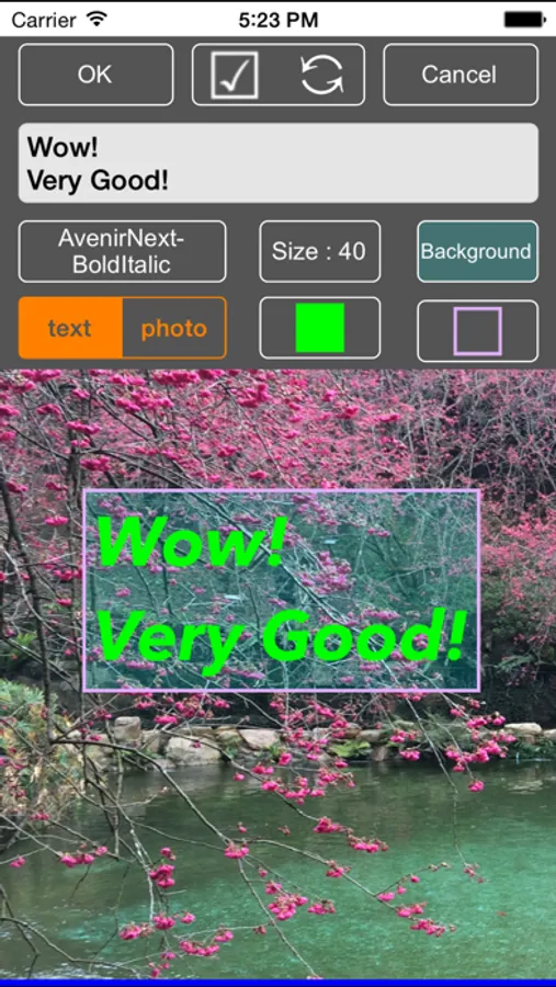 3. Add Text function : ( Text , Font , Size , Text color , Background color , Frame color , Position ).