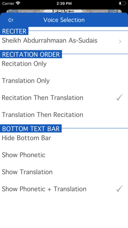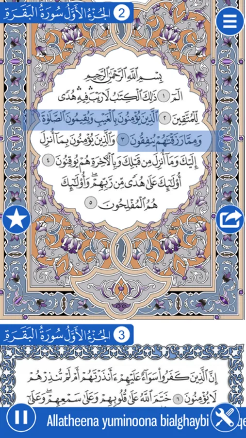 Surah Listing to quick jump to any Surah. Press i button with surah name to get list of all aya numbers in that surah and single tap to jump to specific ayah.