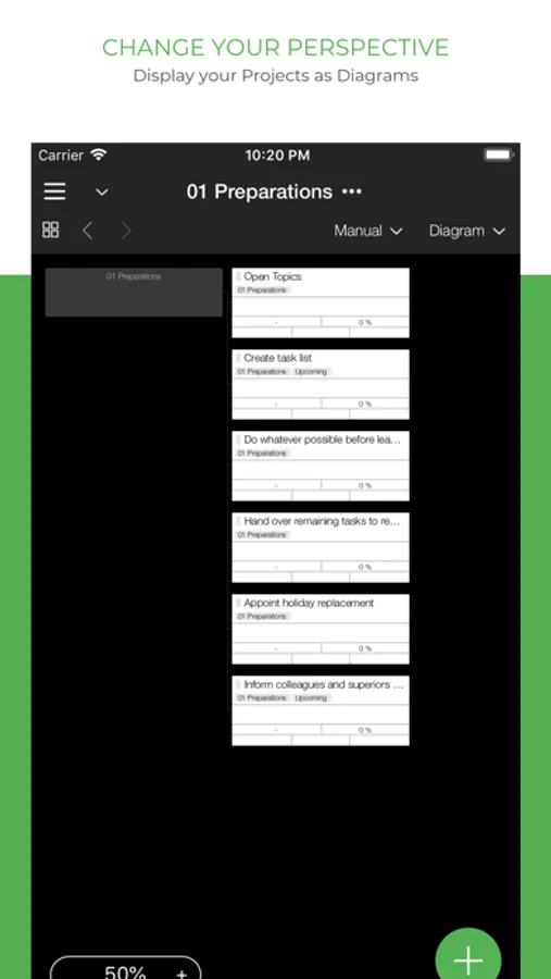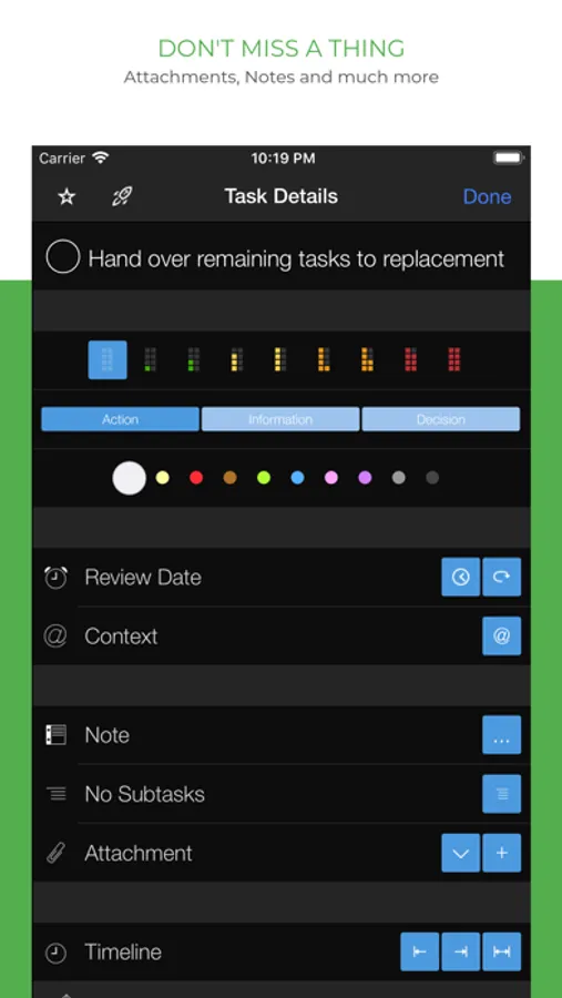 With Taskfabric you can add a formatted note, file attachments and web links to each task to keep everything you need for your tasks in one place. Modern project management standards, like GTD (Getting Things Done), contexts, AID and RACI, are fully supported.