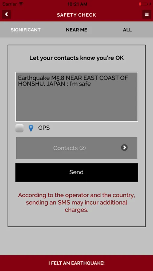 ∘ SMS service to notify loved ones when in the area impacted by an earthquake