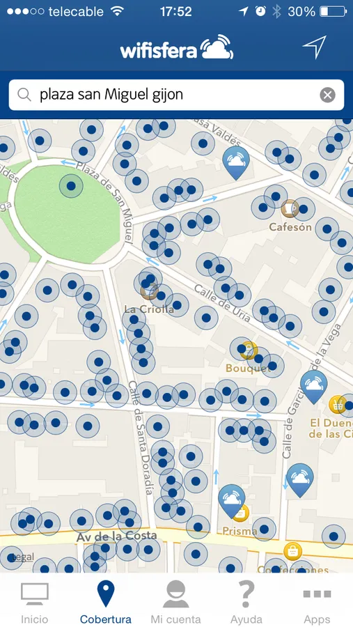 Mediante un sencillo mapa puedes consultar la localización de mayor probabilidad de cobertura de la red wifisfera. Permite igualmente calcular la ruta hasta el punto de acceso seleccionado o posicionar la localización actual sobre el mapa.