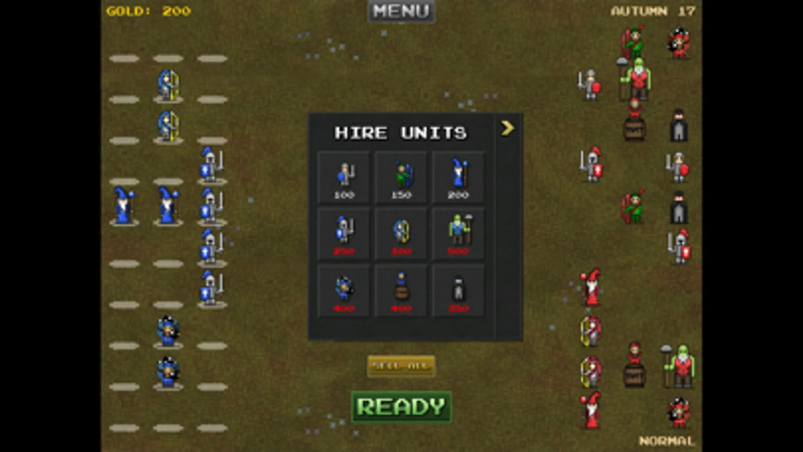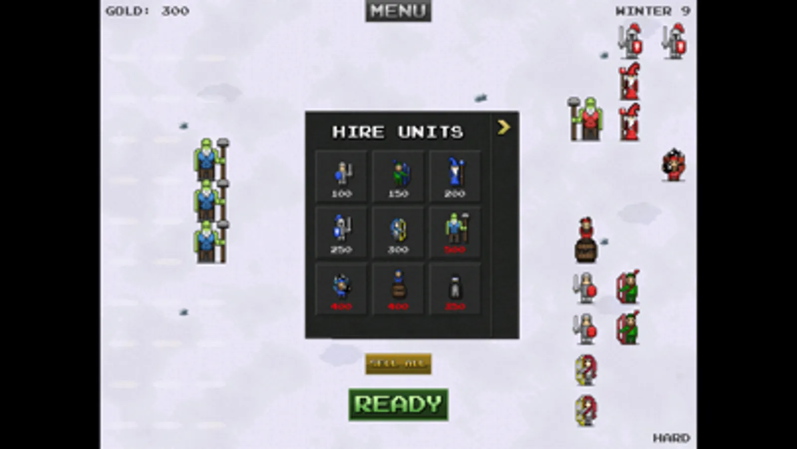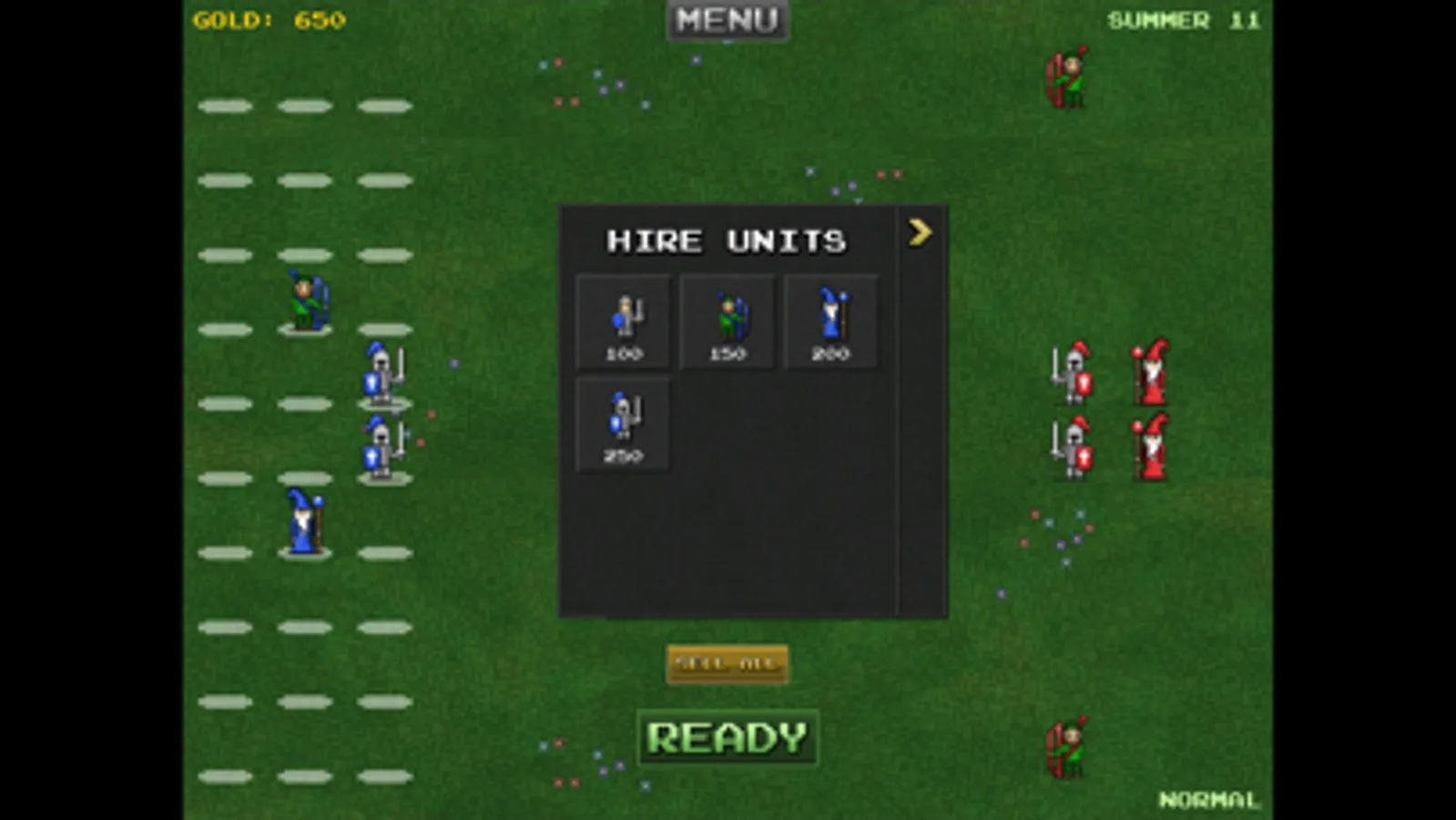 Hire units and place them in strategic formations to counter the enemy army.