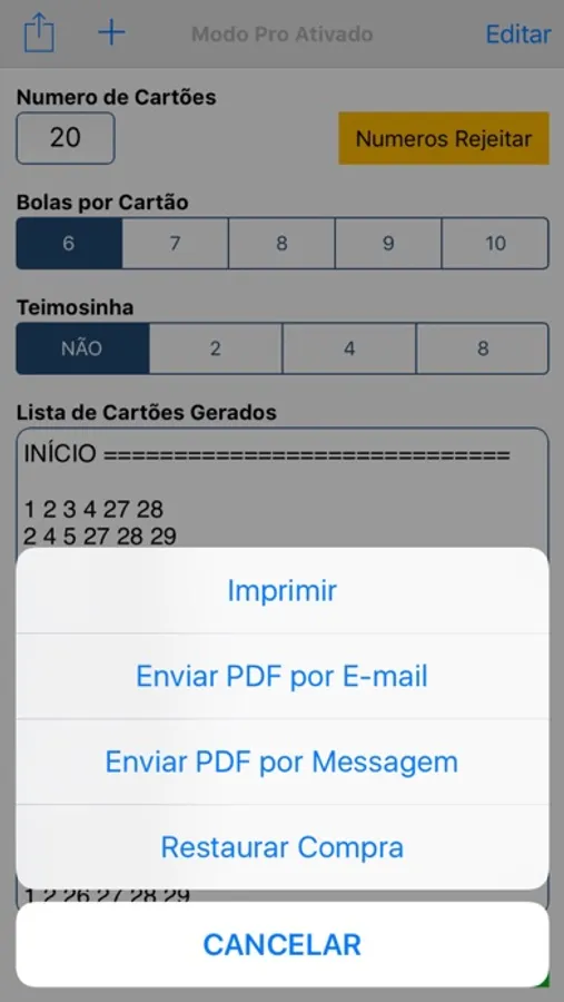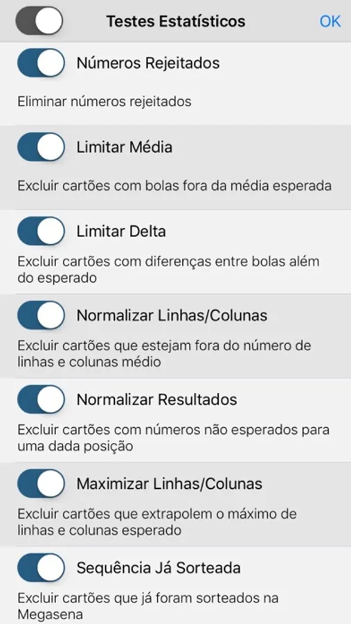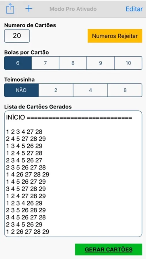 Isso é o que a versão PRO dessa app faz. Gera cartões para a Megasena de forma inteligente, eliminando todas as possibilidades improváveis e que estejam dentro dos padrões que vêm sendo sorteados pela CEF dentro de 25 filtros específicos.