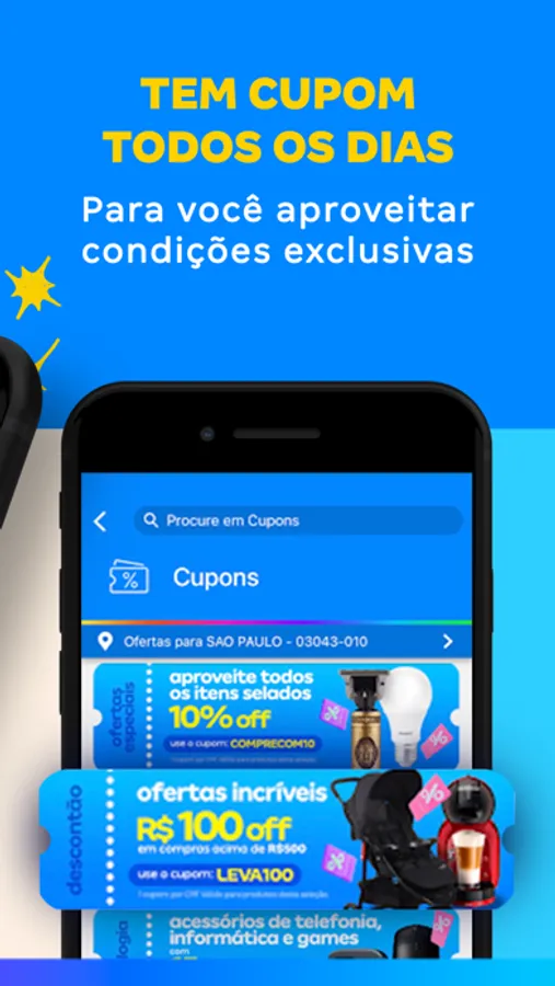 Baixe agora mesmo e aproveite todas as promoções do nosso saldão. Aproveite ainda nosso cashback para ter dinheiro de volta na sua conta e usá-lo como quiser!