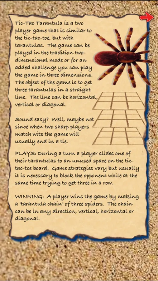 Tic-Tac-Tarantula is a two player game that is similar to the tic-tac-toe, but with animated tarantulas. The game can be played in the tradition two-dimensional mode or for an added challenge you can play the game in three dimensions. The object of the game is to get three tarantulas in a straight line. The line can be horizontal, vertical or diagonal. Sound easy? Well, maybe not since when two sharp players match wits the game will usually end in a tie.