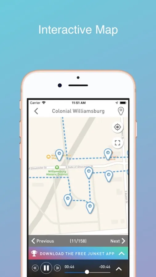 The one and only complete virtual GPS self-guided audio tour through Colonial Williamsburg features 158 locations and 4 hours of audio with images, video, and text. Simply stand in front of a building to listen to its story, click on the interactive map, search for a location by name, or scroll through the list of stops.