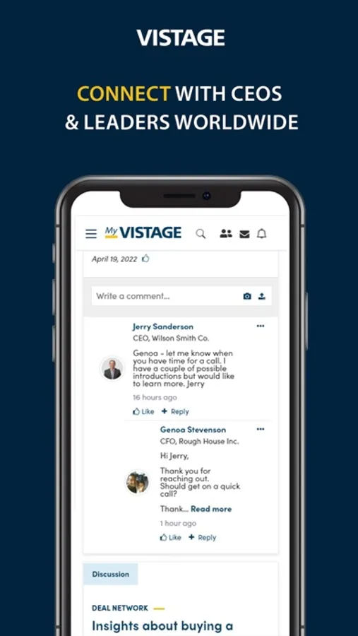 As a Vistage member you’re never in it alone. With the My Vistage app on your phone, you have "always on" access to our platform of trusted resources, your Chair, your group — and a community of peers around the world through our 24/7 online networks.