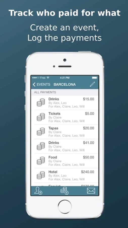 Create an event, and add the participants from your contacts. Then add a payment each time someone pays for the group. If the payment should not be split equally among the participants, you can specify specific shares or amounts.