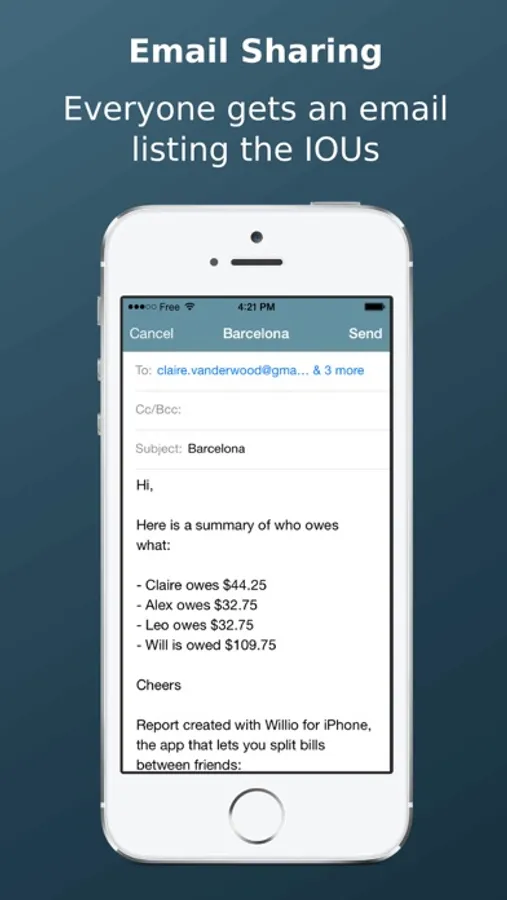 Send an email listing who owes what to all the participants. The email report describes how the debts can be solved. Also the payments description is attached as a spreadsheet file.