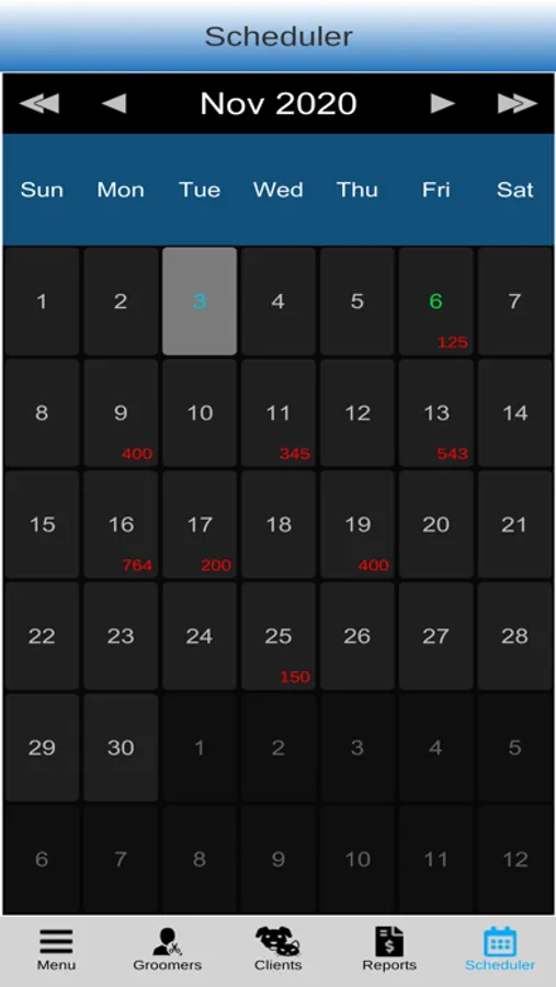 The scheduler and reports section on the pet grooming software shows a calendar that depicts daily sales under each date using which you can calculate total sales along with details of daily sales as well. This calendar also makes it easy to schedule appointments and go through daily routine of commitments without any hassle. Also the reports section offers individual reports on the collective and daily earnings of every groomer saved in the database of the software and reports the collective earning per day as well, including all groomers earnings of the day.