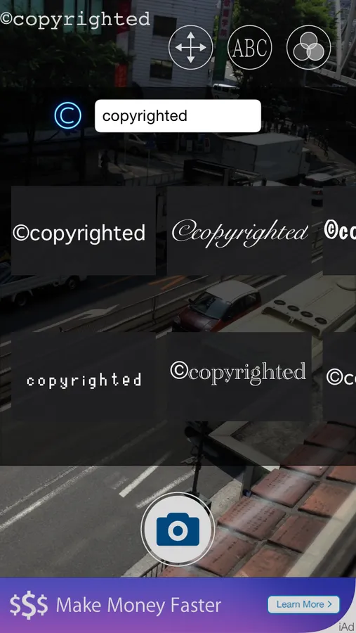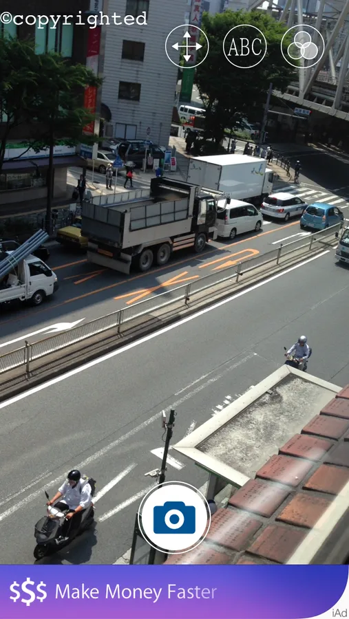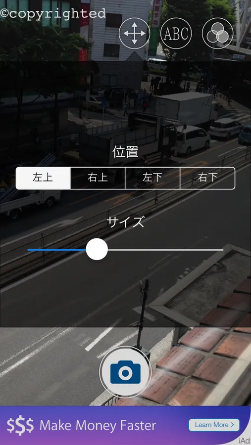 この「Copyrighted」は、カメラで撮影すると同時に「著作権表示=コピーライト」を挿入するシンプルなアプリです。