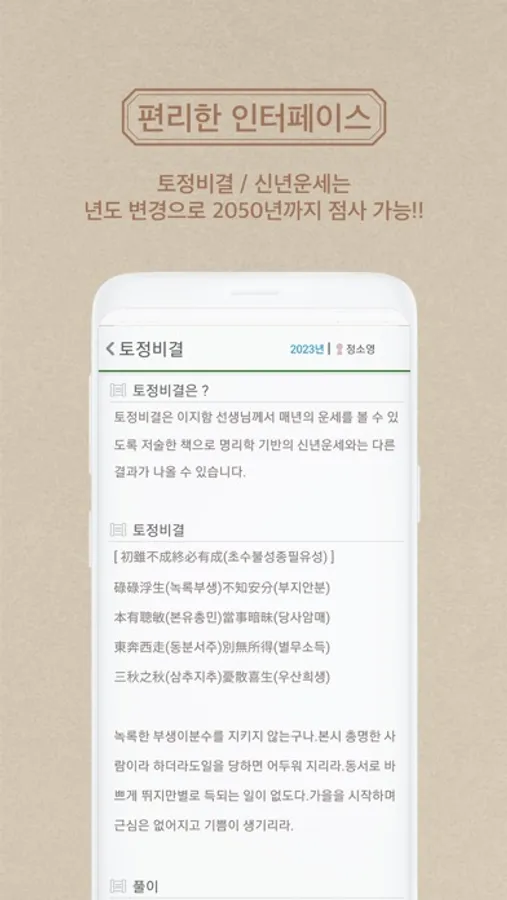 올해는 물론 과거, 미래의 토정비결을 토탈 서비스로 제공하며, 총평/현대적풀이/애정운/재물운/건강운/월별운세 등의 방대한 분량의 내용이 제공되는 명품 토정비결