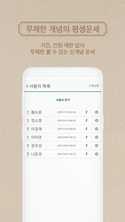 메인>사용자정보/상단 사용자 아이콘에서 사용자추가>운세결과