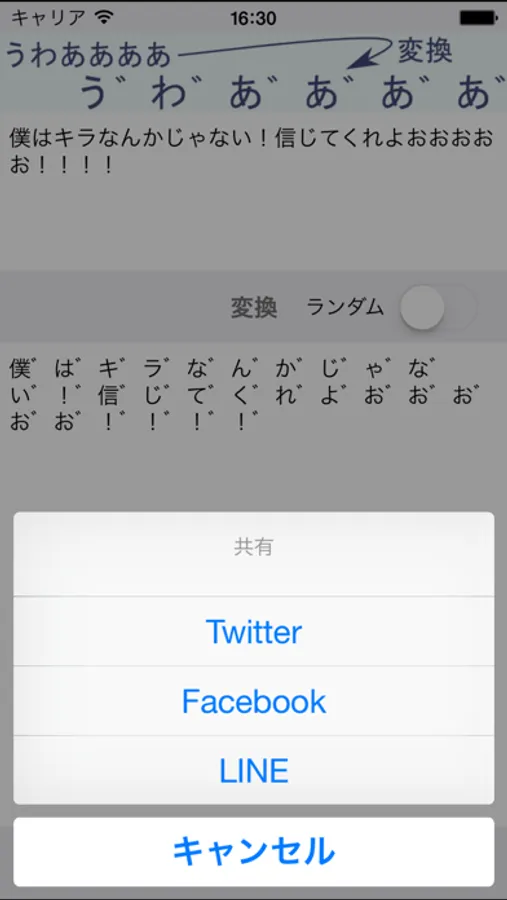 変換した後はコピーしたり、TwitterやFacebook、LINEにそのまま投稿もできます