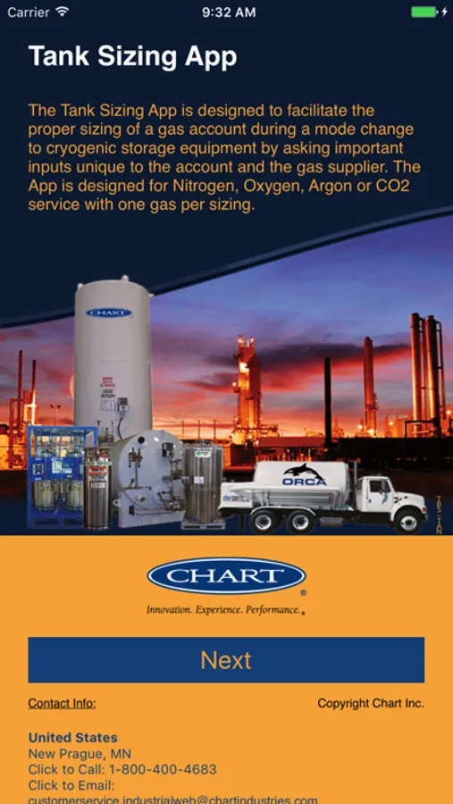 This app is to provide assistance in the proper sizing of a gas account during a mode change to cryogenic storage equipment by asking important inputs unique to the account and the gas supplier. The app is designed to work for nitrogen, oxygen, argon and carbon dioxide service with one gas per sizing.