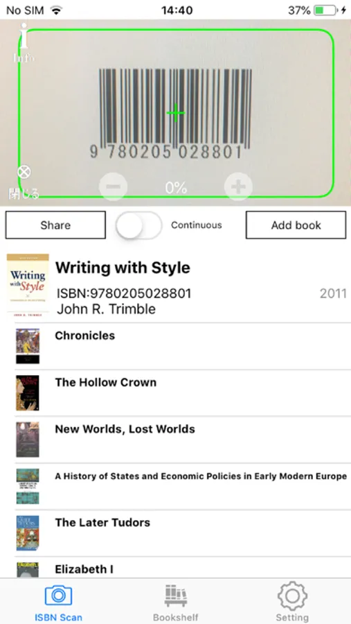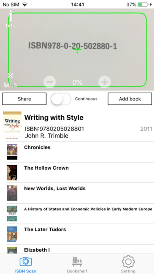 There is no need to press the shutter when reading, this application reads live images reflected in the camera just by simply waving your device. It has ability to read the ISBN at high accuracy with super-fast speed.