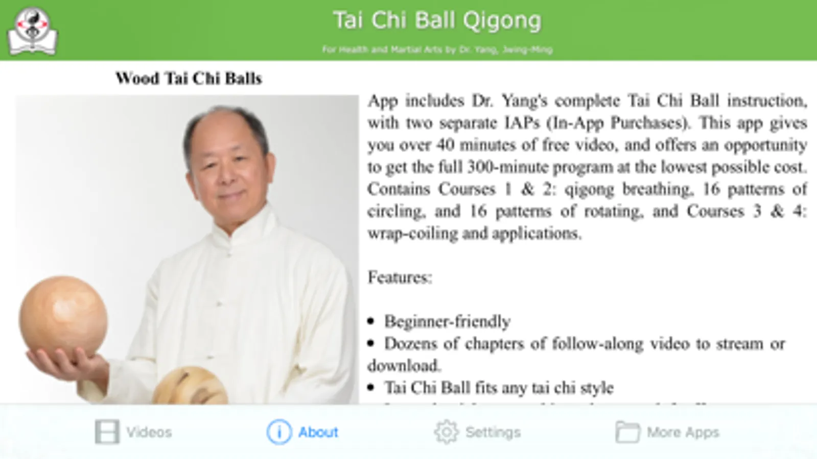 After learning from your free videos, you may access the full-length programs with an in-app purchase. In the first 3-hour video, Master Yang will teach you how to choose a Tai Chi Ball, Qigong Breathing techniques and many Tai Chi Ball Circling and Rotating Patterns you can use to quickly improve your fitness.