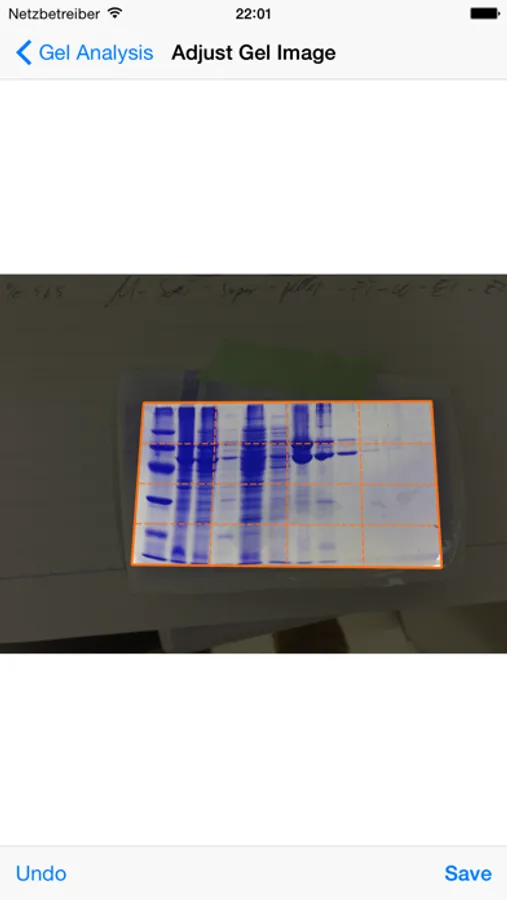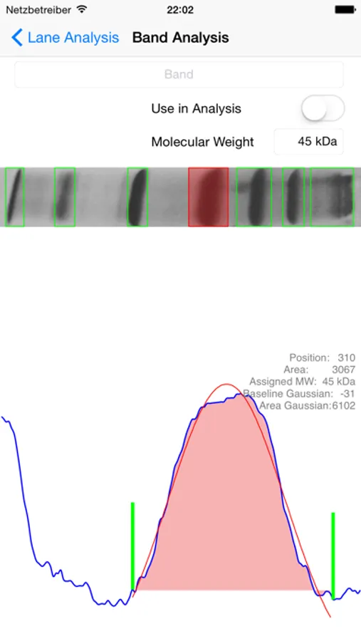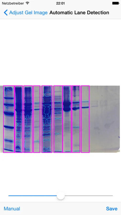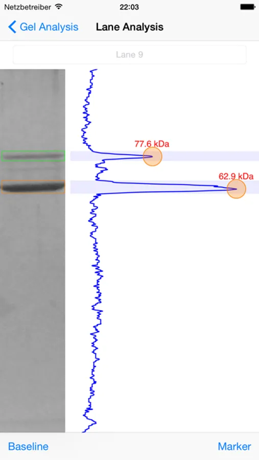 Simply snap a picture of your gel, crop to the desired region and MyGels will automatically recognise lanes and bands. You can calibrate the gel to determine molecular weights, quantify bands, and export beautifully annotated gels, plots of your bands of interest, and of course all the raw data for analysis in third-party software.