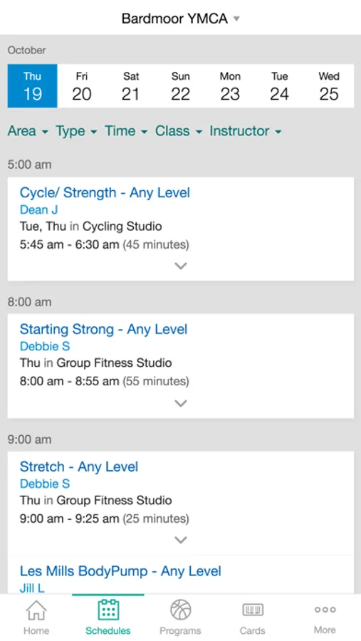 • Easily view schedules for each day and filter for the types of classes that you like.