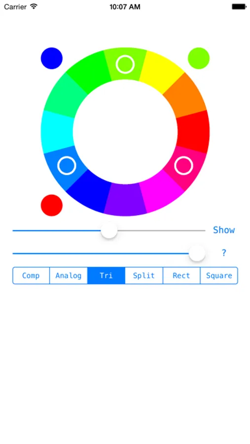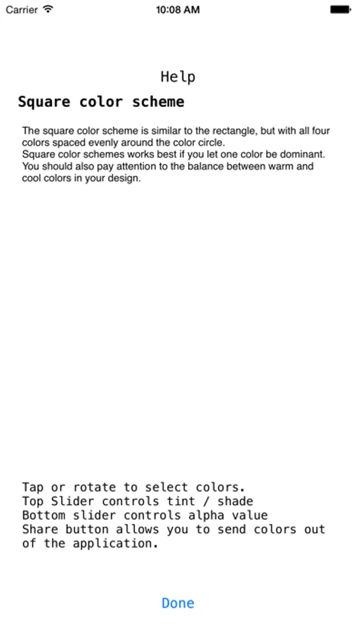 Color Wheel is an application to help people (programmers, designers, etc...) find sets of colors that work well together. Choose between Complimentary, Analogous, Triadic, Split-Complimentary, Tetradic, and Square color schemes. Adjust the tint / shade and transparency of the color. Once you have a set (palette) that you like, share it (Twitter, Facebook, email, copy to pasteboard, etc...)