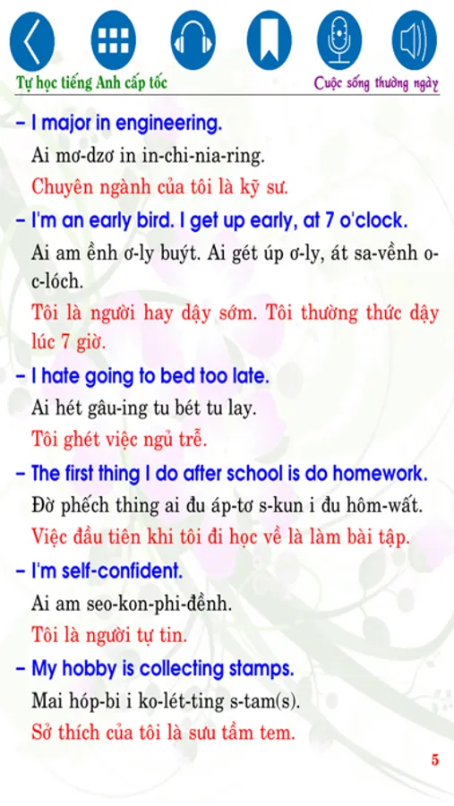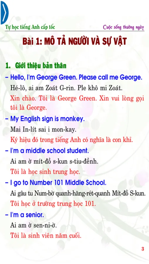 Quyển sách “Tự học tiếng Anh cấp tốc - Tiếng Anh trong cuộc sống thường ngày” gồm 183 trang được biên soạn theo tiêu chí “Học tiếng Anh mọi lúc mọi nơi” khi trong tay có chiếc điện thoại thông minh. Trong quá trình biên soạn không khó tránh khỏi những sai sót ngoài mong muốn, hy vọng sự đóng góp quý báu từ các bạn để giúp quyển sách ngày càng hoàn chỉnh hơn.…; Sách được tích hợp âm thanh (audio) vào trong sách, đánh dấu từng câu khi đọc, khi cần nghe lại câu vừa đọc hay câu nào đó thì bạn chỉ cần chạm tay vào câu đó thì sẽ phát âm thanh để bạn nghe lại; Ngoài ra SmartBooks còn có tính năng thu lại giọng đọc (giọng của bạn tập đọc câu vừa học) của bạn bằng cách nhấn vào icon Micro (icon Recorder), khi bạn nhấn vào icon Headphone (listen and write - nghe và viết), xuất hiện màn hình có rất nhiều tính năng giúp bạn nghe và viết lại câu vừa nghe bằng phím hay bằng tay,… Đây là một bước đột phá của chúng tôi trong thời đại công nghệ số nó sẽ giúp các bạn rất nhiều trong việc học ngoại ngữ và đọc sách thật tiện lợi.