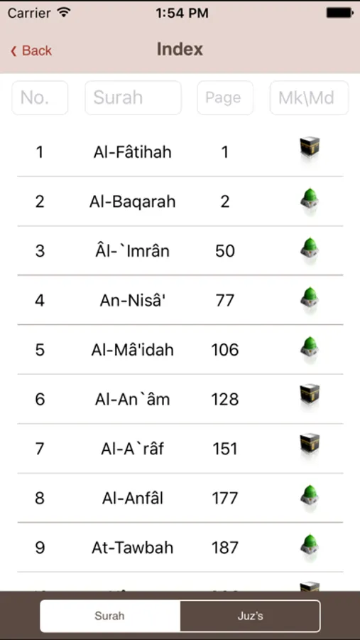 - A classic index of Surahs with the ability to search for the Surah.